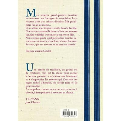 "Mes arrières grand-parents tenaient un restaurant en Bretagne, ils recopiaient leurs recettes dans des cahiers d'écolier. Ma grand-mère faisait de même... Ces cahiers sont toujours restés dans la famille. Nous avons rassemblé dans ce livre ces recettes simples et fidèles transmises de mère en fille. Nous avons ajouté quelques autres recettes savoureuses de tantes, d'oncles et d'amis bretons. Surtout, que ces saveurs ne se perdent jamais !", Patricia Cariou Cristol. "Une pincée de tradition, un grand bol de créativité, tout est là, réuni, pour inciter le lecteur gourmet à se mettre aux fourneaux et à s'approprier les recettes qui illustrent ces pages riches d'histoire, de savoir-faire et de gourmandise ! A compulser comme un carnet de chansons, à choisir, à interpréter et à savourer en chur", Tri Yann Jean Chocun.